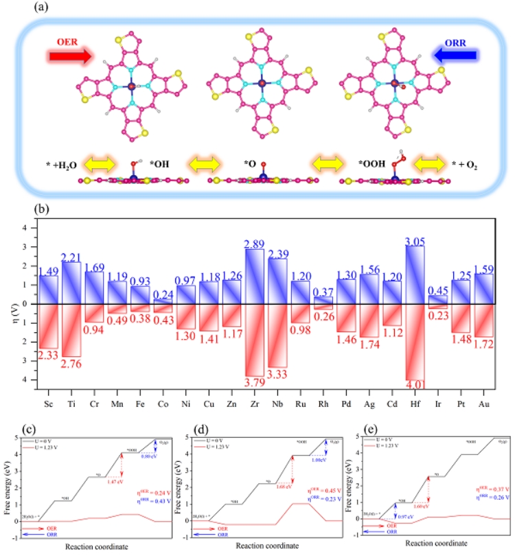 开发高性能的HER/OER/ORR电催化剂用于水分解产氢以及燃料电池具有重要意义。在这个工作中,通过密度泛函理论计算预测了一种新型的卟啉(以噻吩作为连结剂)催化剂。得到了Co, Rh和Ir-N4/TP催化剂表现出对OER/ORR低的过电势。其中Co-N4/TP表现出0.07/0.24/0.42 V过电位,能够作为一种三功能催化剂用于水全分解和氧还原反应。反应动力学能垒表明Co-N4/TP遵循Volmer-Heyrovsky机制。此外,在这三种催化剂上,二电子反应产物H2O2也能够被抑制。催化剂的稳定性通过结合implicit solvent与constant potential methods来评估。结果表明在实际工况下-1.50 V (vs. RHE),金属原子并不会发生团聚,表明了优异的稳定性。在活性起源方面,金属中心的氧化,体系磁性与OER/ORR催化活性密切相关。最终通过机器学习对本征性质进行优化,得到d带中心与HER 性能相关,但在OER/ORR,每个中间产物对应的本征性质是变化的。