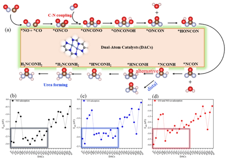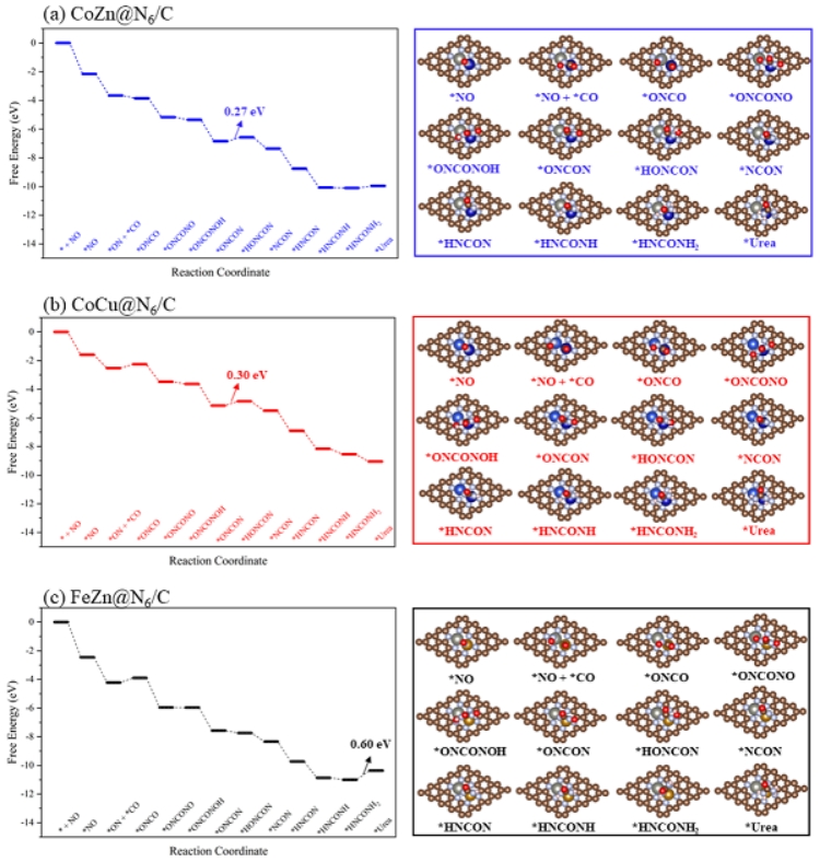 当前尿素是通过CO2NH3在高温高压条件下合成的,这一过程不仅耗能极大且不环保。因此,探索高性能的电催化剂在常温常压下用于尿素合成具有重要意义。在这个工作中,基于密度泛函理论计算,作者构建了一系列双原子催化剂,以两种气体污染物(NO与CO)作为N源与C源进行C-N偶联产尿素。结果表明稳定吸附的NO与CO能够促进C-N偶联以及连续的氢化反应。通过筛选, CoZn, CoCu, and FeZn@N6/C催化剂能够持续的接受质子/电子对,实现尿素的生成,分别表现出−0.27,−0.30,和−0.60 V的过电位。同时尿素产生是遵循alternative机制。此外,引入溶剂化效应与恒电势模型探索了在真实反应条件下C-N耦合动力学能垒,只有0.75eV。竞争性反应如HER与NRR也得到了很好的抑制。因此表现出产尿素的高选择性在这三种电催化剂上。