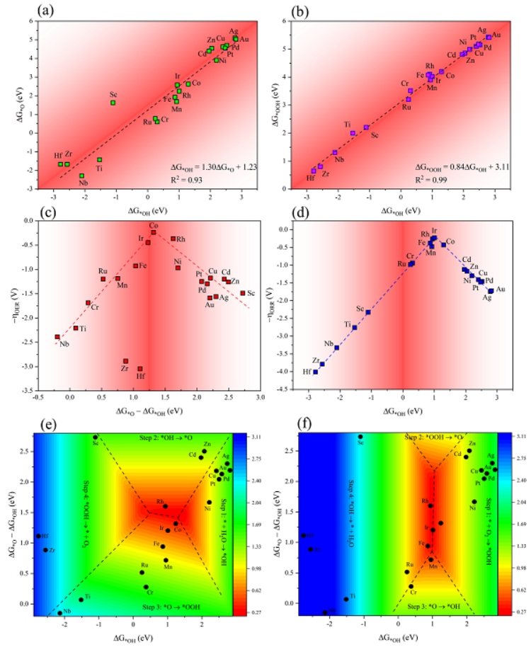 2. OER/ORR反应中间产物自由能变的标度关系,过电位的火山图