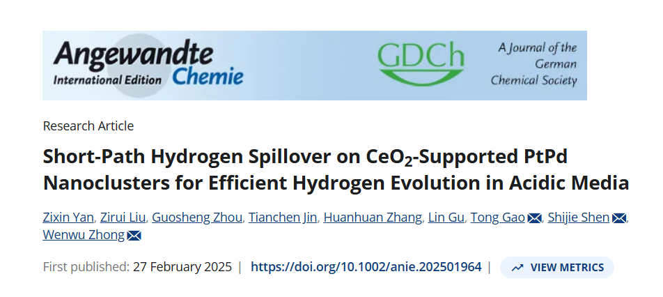 院长钟文武教授团队在电催化析氢反应(HER)研究领域取得重大突破,相关研究成果以《Short-Path Hydrogen Spillover on CeO₂-Supported PtPd Nanoclusters for Efficient Hydrogen Evolution in Acidic Media》为题,发表于国际顶级化学期刊《Angewandte Chemie International Edition》,为高效析氢催化剂的研发提供了新路径。