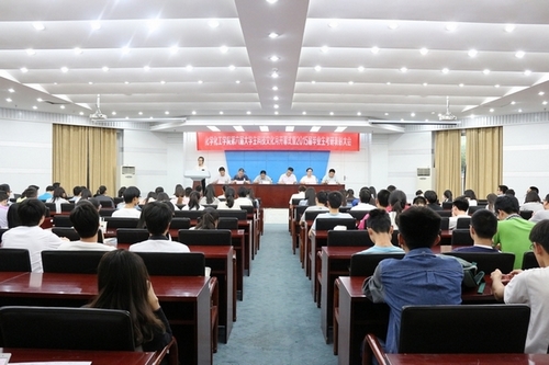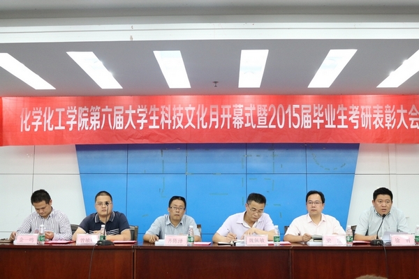 在图书馆一楼报告厅举行第六届大学生科技文化月开幕式暨2015届毕业生考研表彰大会,校学工部、团委负责人和51视频