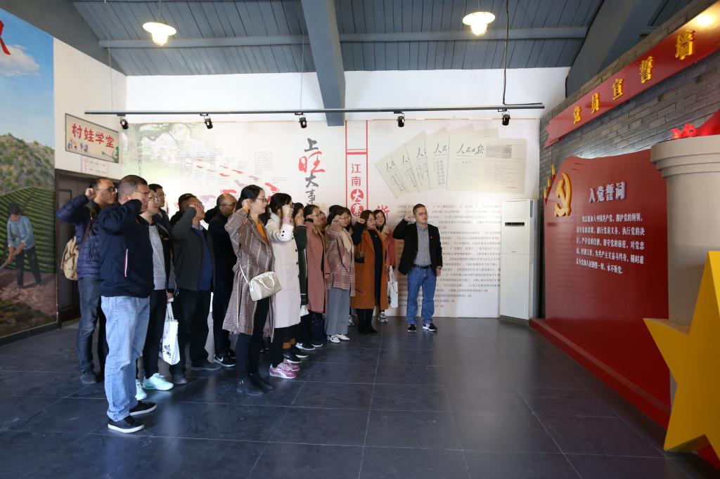 全体教师党员首先来到主题党日活动第一站——富盛镇上旺精神陈列馆,上旺精神陈列馆始馆藏丰富,生动地展现了上世纪五十年代上旺村在王金友等一批实干标杆带领下,用“八把山锄创大业”的艰苦奋斗和集体主义精神。“上旺精神”深深地打动学习参观的教师党员,党员们伫立在党旗前,举起右手重温入党誓词。庄严的誓词飘荡在陈列馆内,也震撼着每一位党员内心深处。上旺人自强不息、积极进取的精神,激励着党员同志们干事创业的精气神,增加了党员同志们为绍大创建添砖加瓦的热情劲。