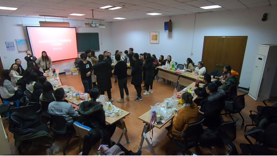 在表演节目完毕后,大家进入了欢愉的娱乐时间。各年级同学随机组队,共分为5个小组开始了游戏环节。首先进行了“你画我猜”的抢答环节。各组同学脑洞大开,积极抢答,同时也被部分有趣的绘画图像逗乐,笑果极佳。随后进行了“谁是卧底”的脑力比拼。最后也是最热闹的游戏环节“短饼干挑战”,通过各组参赛选手的实力比拼,最终第三小组笑到了最后!