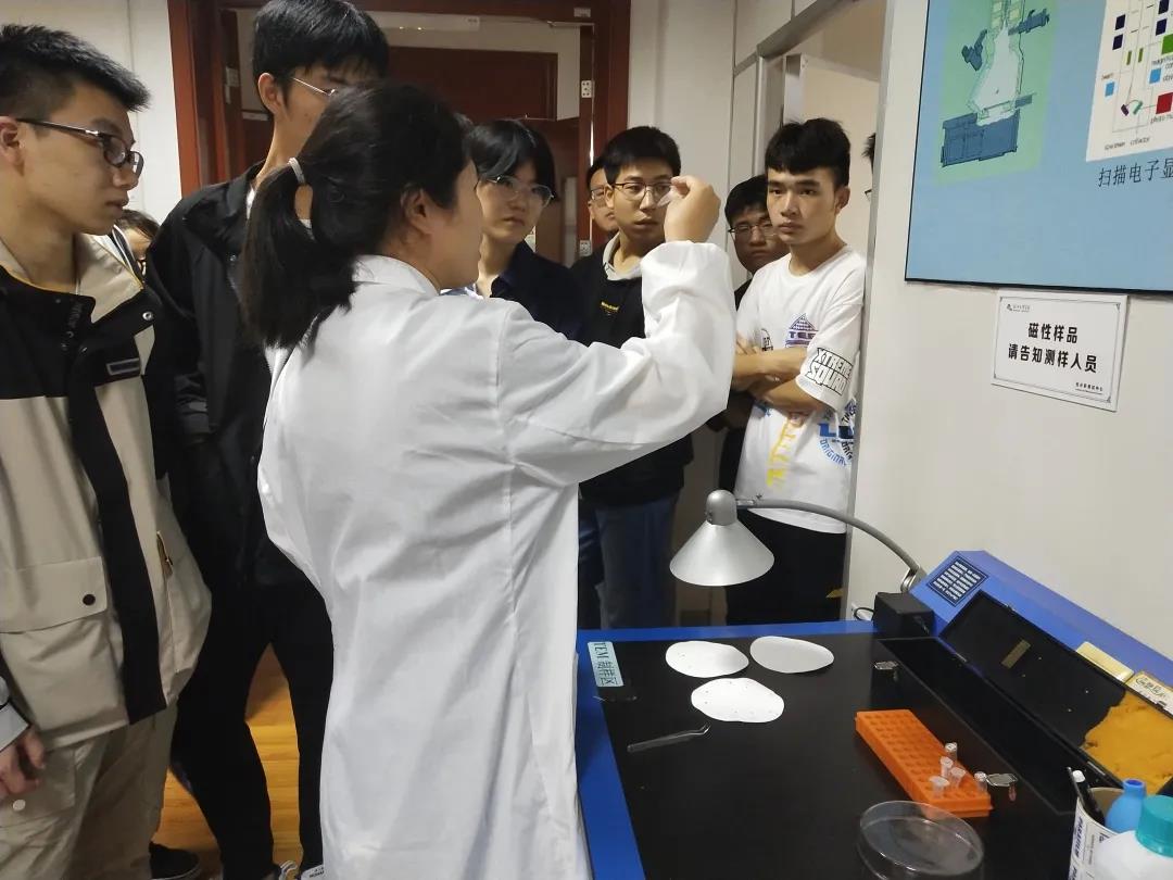 进入分析测试中心后,老师们带领同学们进入实验室、仪器室、细胞间进行参观学习。老师向同学们讲解了分析天秤、高效液相色谱-质谱联用仪、电感耦合等离子体发射光谱仪、X-射线衍射仪、高分辨透射电子显微镜、气相色谱-质谱联用仪、透射电子显微镜、扫描电子显微镜-能谱、核磁共振波谱仪、高效液相色谱仪、超声波细胞粉碎机、超低温冰箱等仪器设备的应用范围以及对送检样品的要求。