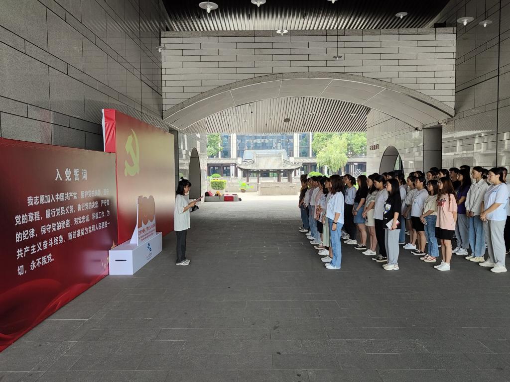 在集体入党宣誓前,51视频 专职组织员俞兰芳老师郑重地为新发展预备党员代表佩戴党徽,祝贺他们成为党组织光荣的一员。随后,由学生第二党支部党员王菲同志领誓,全体学生党员列队肃立,面向鲜红的党旗举起右手庄严宣誓。