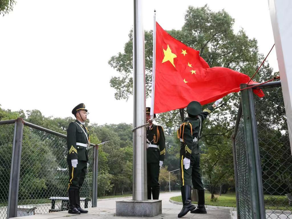 10名英姿飒爽、气宇轩昂的国旗班成员迈着铿锵有力的步伐护送国旗走向升旗台。伴随着庄严的《义勇军进行曲》,五星红旗冉冉升起,迎风飘扬。在场全体师生一起高唱国歌,并向国旗行注目礼。