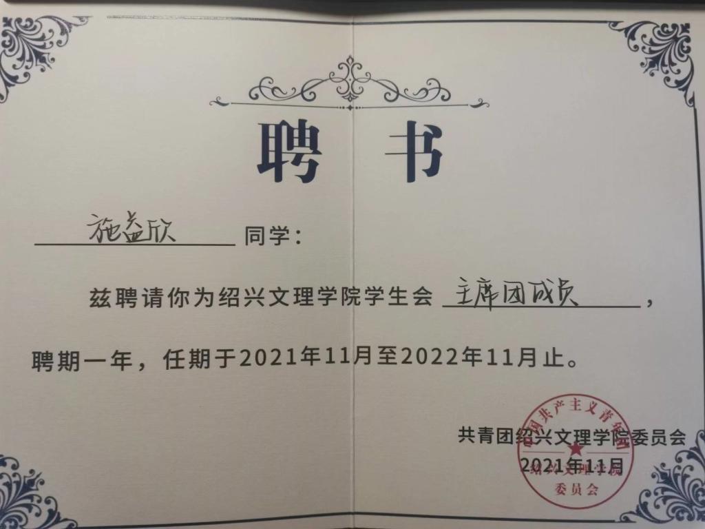 的学生组织里任职的日日夜夜,还是在班级里为同学服务的晨光夕阳,都能看到他的身影。在这过程中他也收获了最真挚的友谊与感动。作为学长,他经常帮着学弟学妹们解决学习、生活中遇到的问题,展现了文理学子乐于助人、团结友爱的精神风貌。在同学谢超颖眼中,施益欣是一位积极进取、有责任有担当的学长。
