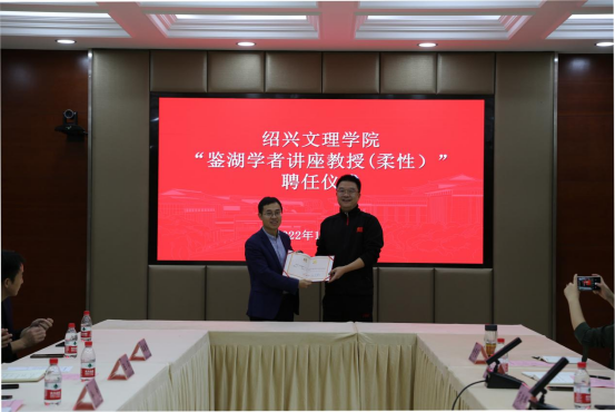 陈均土为范骁辉教授颁发“鉴湖学者”讲座教授聘书。