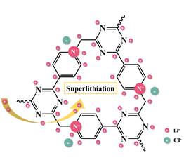本研究报道了一种吡啶基聚离子液体(PILs-Py)作为锂离子电池负极材料的应用研究,并探讨其储锂机制。以一种含有氰基的吡啶基离子液体(ILs-Py)为单体,ILs-Py在400摄氏度下发生聚合反应生成一种具有规则的分子孔结构的PILs-Py。PILs-Py负极在0.1 A g-1的电流密度下获得了高达1694 mAh g-1的放电比容量。储锂机制表明:在嵌锂过程中,N和C分别与Li形成N-Li键和C-Li键而储锂,材料实现了Li6(C/N)6的超锂化结构,可以说该研究成果已经到达有机聚合物的储锂极限。与先前聚合物相比,PILs-Py的优势在于聚合物主链不仅可以通过链段运动改善Li+的迁移动力学,同时含有吡啶鎓的带电结构与Li+之间的静电互斥作用加速其扩散速率,使Li+更快地到达储锂位点,充分发挥材料的储锂潜能。