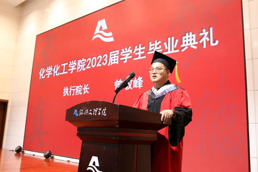 执行院长曾敏峰讲话,他表达了对毕业生们四年来的辛勤付出的肯定和取得的成绩的赞许。他向毕业生们提出了三个关键词:“目标、责任、自信”,鼓励他们尽早设立人生目标,担负起社会责任并信心满满地迎接未来挑战。最后,他祝愿毕业生们前程似锦,一帆风顺。