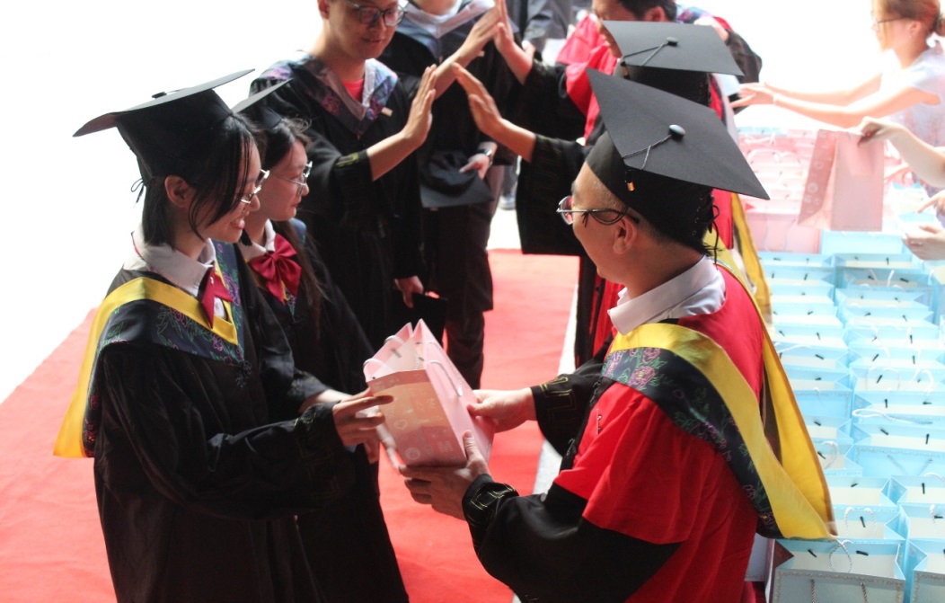 领导班子列队欢迎全体毕业生,与毕业生互动,并发放了精美的纪念品。