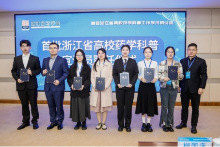 党委副书记杨慧蓉为浙江省高校药学科普指导老师颁发聘书。浙江省中医院/浙江中医药大学附属第一医院院长助理王建平为首批浙江省高校药学科普宣讲员颁发聘书。
