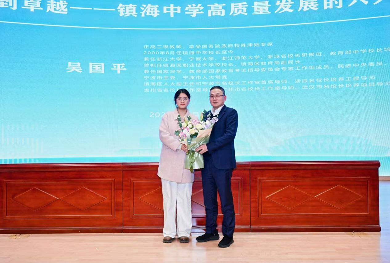 潘华泉对吴校长的倾囊相授表示衷心感谢。他总结了讲座的六大关键点,这些内容既凝聚了镇海中心数十年的办学智慧与经验积淀,也展现了新时代教育高质量发展的路径与前瞻探索,整场讲座不仅深刻启迪思想,更启迪人生。报告结束后由学生代表科教221班尤嫣然同学为吴校长献花。