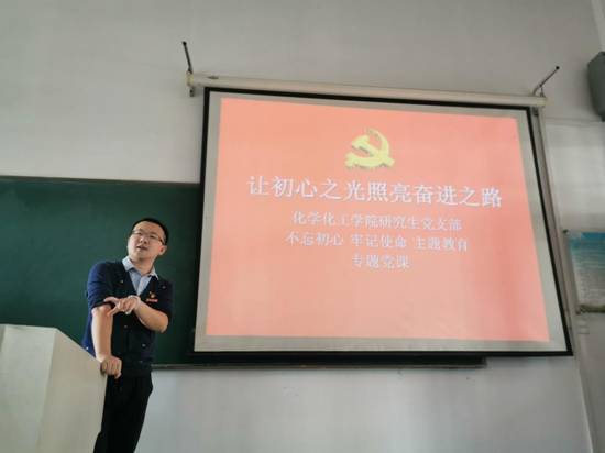 随后,支部书记赵健给全体党员上了题为《让初心之光照亮奋进之路》的专题党课。赵老师强调,“不忘初心、牢记使命”是在我们党领导中国人民进行新的伟大长征的关键历史节点,在中国由大向强发展的关键历史阶段,习近平总书记对全党最严肃也最真切,最深刻也最平实,最重要也最明确的政治提醒和政治要求,它源于对我们党的性质宗旨、历史经验和优良传统的宏大思考,是对我们党进入新时代、踏上新征程、迎接新挑战的战略动员。党课从让初心之光照亮奋进之路,就是要在弘扬“红船精神”、把握先进之源中谱写时代凯歌;让初心之光照亮奋进之路,就是要在高举伟大旗帜、推进理论武装中谱写时代凯歌;让初心之光照亮奋进之路,就是要在增强党性修养、践行根本宗旨中谱写时代凯歌;让初心之光照亮奋进之路,就是要在攻坚克难求作为、闯关夺隘敢斗争中谱写时代凯歌。四个方面做了详细讲述!全体党员同学受益匪浅。