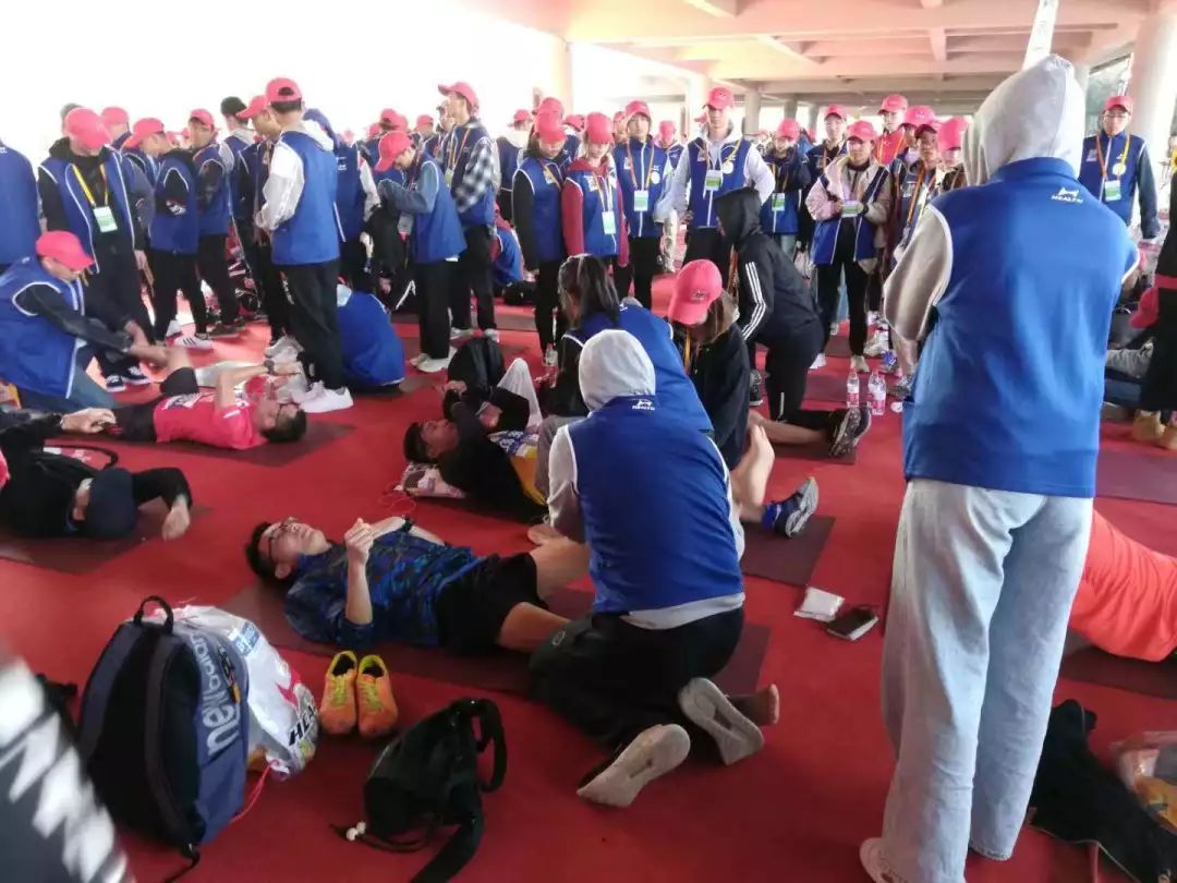 从上午九点-下午两点,参赛完毕的运动员纷纷抵达终点,来到我们的营地准备进行赛后拉伸。志愿者们认真细致的服务态度以及训练有素的工作能力得到了运动员们的一致好评。