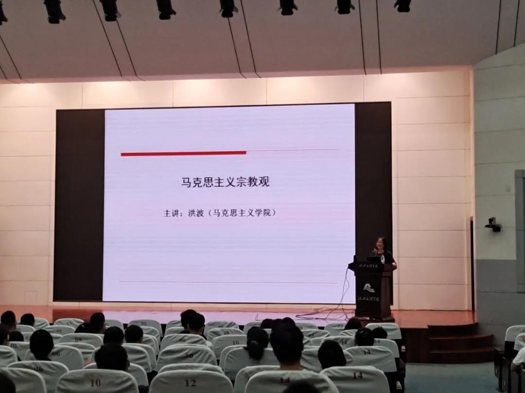 在铁城科教馆报告厅举行2020级新生马克思主义宗教观及国家宗教政策法规教育讲座,旨在帮助大家树立对马克思主义宗教观的正确认识。本次讲座特别邀请马克思主义学院的洪波教授主讲。