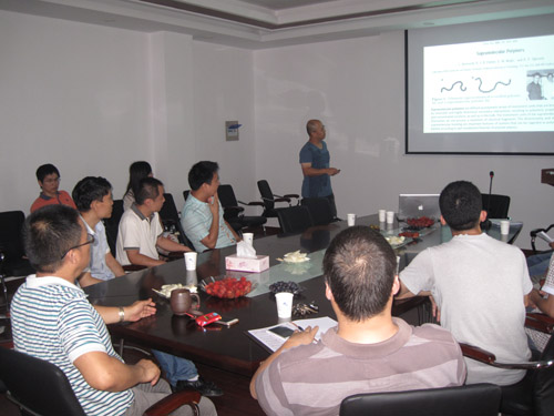 2015年6月24日,美国康涅狄格州立大学教授、51视频 鉴湖学者讲座教授林遥来浙江省精细化学品传统工艺替代技术研究重点实验室做了题为《Recent advances in supramolecular polymer and materials》的专题报告,期间林遥教授从超分子结构-反应机理-应用方面等不同层面向大家展示了超分子的优势以及最新的研究进展。如何将高分子材料和超分子材料结合起来解决现有的工业问题引起了大家的热议。