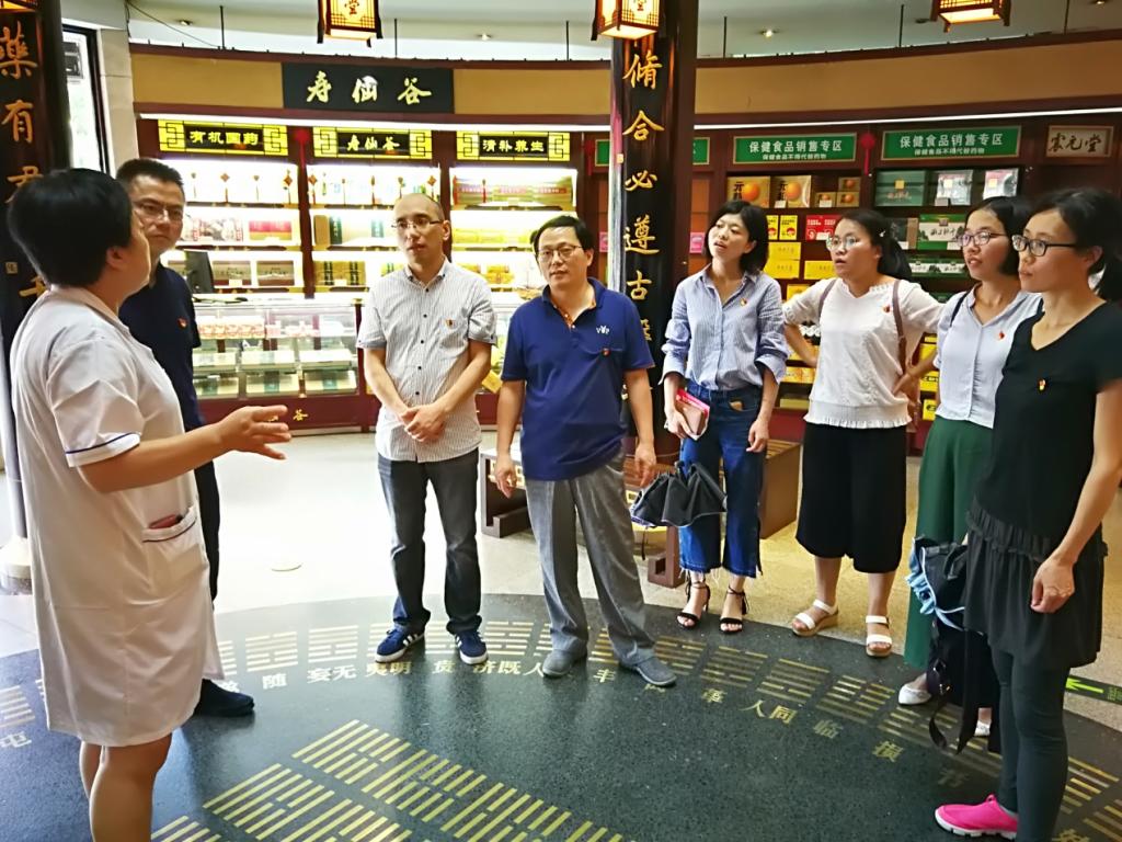在震元支部王建东同志的带领下,一行人认真参观了店内处方药柜、非处方药柜、保健品区、医保用药区、艾灸区、中医诊疗区、中药房等场所;了解到震元是一个不断谋求创新发展的企业,这和习近平总书记在党的十九大报告中所指出的“创新是引领发展的第一动力”不谋而合。比如,“药店+诊所”、“药店+中医馆”的新型零售经营方式的推出,使患者享受一站式服务和个性化服务,里面的坐诊中医都是经验丰富的名老中医,这些服务甚至已经超越了部分专科医院,病人对此项举措也是好评如潮。这也是本支部值得学习借鉴的地方,在人才培养上也应该与时俱进,要跟上时代的步伐,推陈出新,让学生的综合素质得到全面提高。