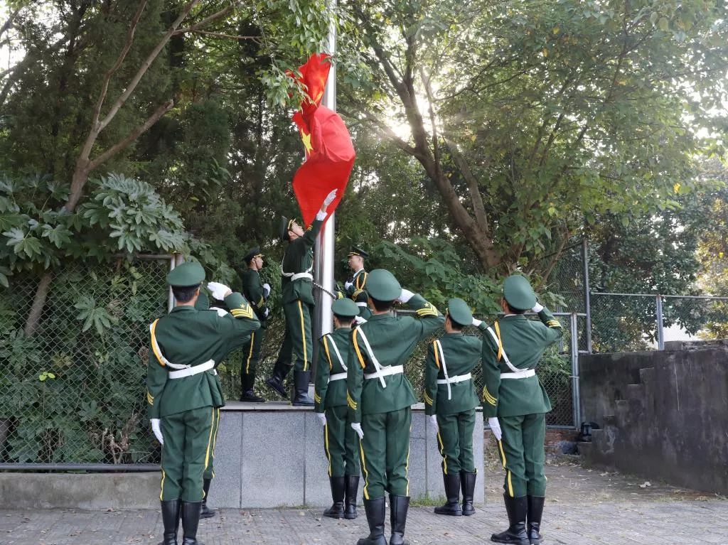 我校10名英姿飒爽、气宇轩昂的国旗班成员,迈着铿锵有力的步伐护送国旗走向升旗台。伴随着庄严的《义勇军进行曲》,五星红旗冉冉升起,迎风飘扬。在场全体师生一起高唱国歌,并向国旗行注目礼。