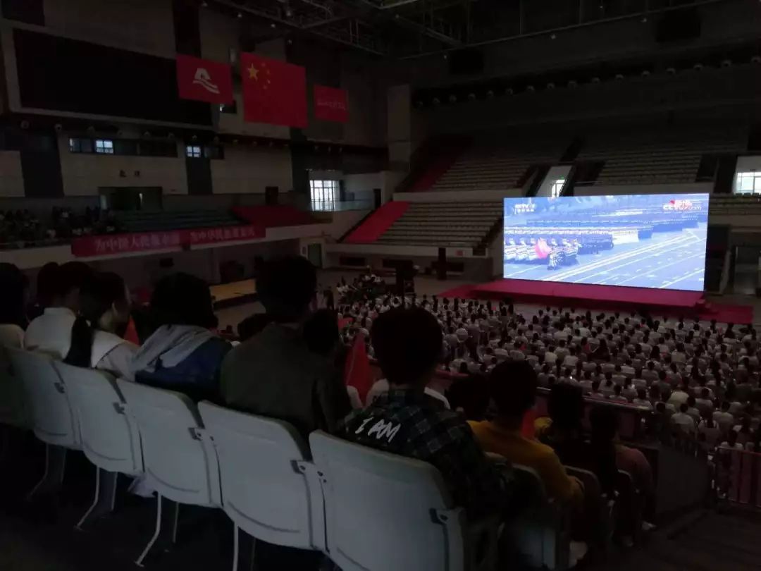 200余名师生代表在河西体育馆,共同收看庆祝中华人民共和国成立70周年大会和阅兵式实况直播。